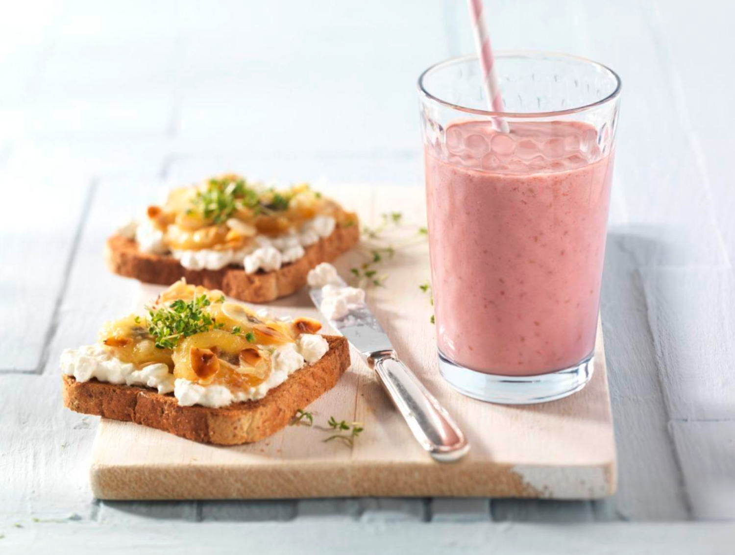 - Die Toastscheiben toasten, mit dem Frischkäse bestreichen und die Bananenscheiben darauflegen. Mit Kresse bestreuen. Den Smoothie dazu servieren.