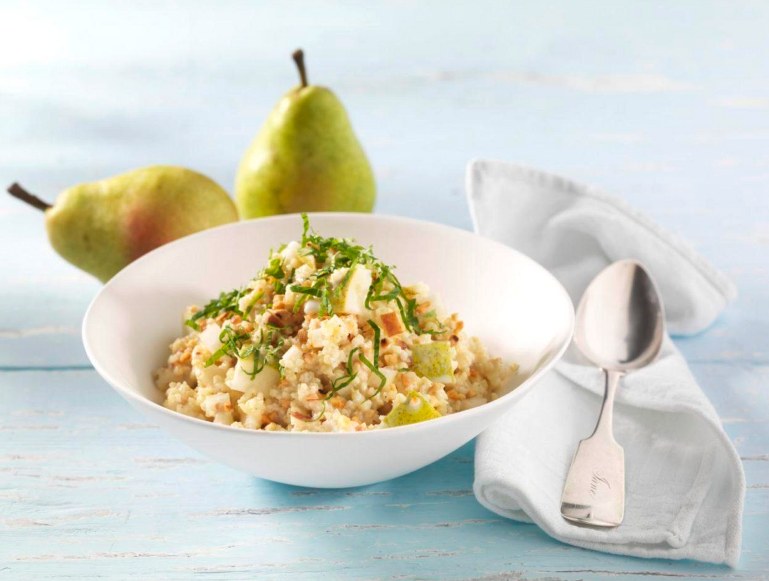 150 g Goldhirse Salz 40 g gehackte Mandeln 1 Stiel Minze 1 kleine Birne 175 g Dickmilch 100 g Magerquark 1 TL Honig 1 Prise Zimt