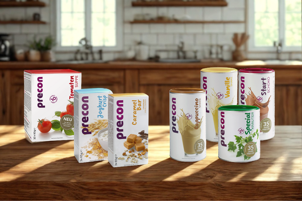Unsere Pakete enthalten verschiedene Precon Produkte (z. B. Shakes, Müsli, Riegel oder Suppen). Alle Produkte sind nach den gleichen hohen Qualitätsstandards hergestellt und als vollwertige Mahlzeiten im Rahmen der Precon Ernährung geeignet.