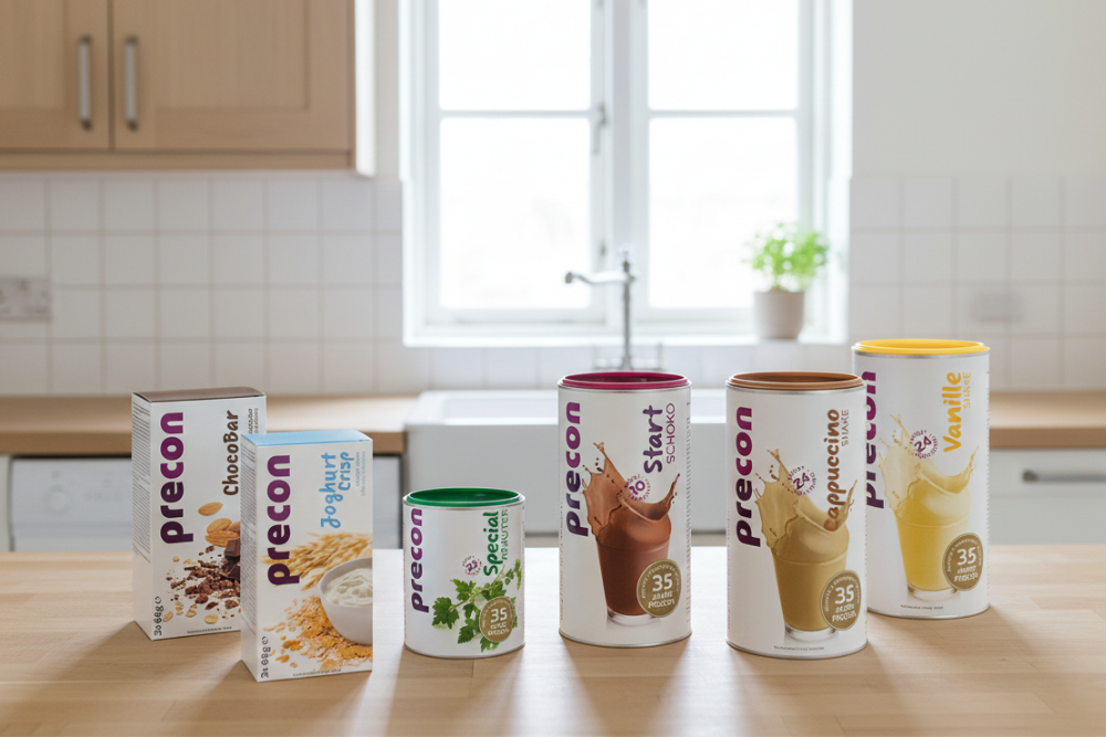 Mit dem Precon 4-Wochen-Startpaket lernst Du das bewährte Precon Ernährungskonzept ganz einfach kennen. Es enthält alles, was Du für einen sanften Einstieg in Deine persönliche „Precon-Abnehmreise“ brauchst – ideal, um erste Erfolge zu erleben und Dich mit den Produkten vertraut zu machen.