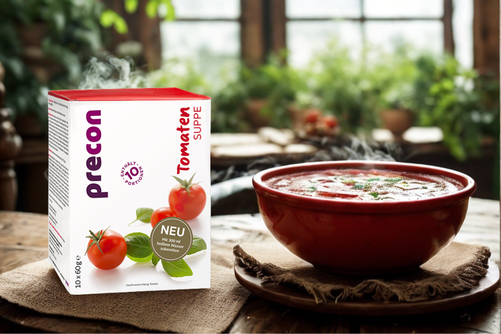 Eine Schachtel Precon Tomatensuppe zeigt Bilder von frischen Tomaten und Basilikum, enthält 10 Portionen, ist ideal für Diäten zur Gewichtsabnahme und enthält eine Anleitung zur Zubereitung mit 300 ml heißem Wasser.